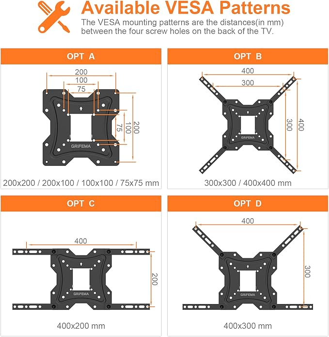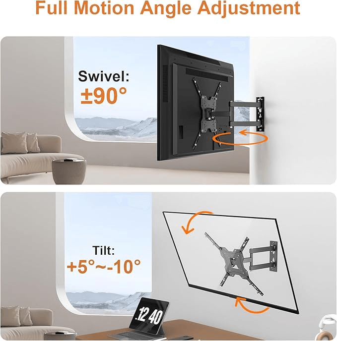 RÉGLABLE – Le support tv mural orientable peut orientable ± 90 °, inclinaison avant et après + 5 °, -10 °, protection contre l’éblouissement. Profitez du meilleur angle de vue de l’écran